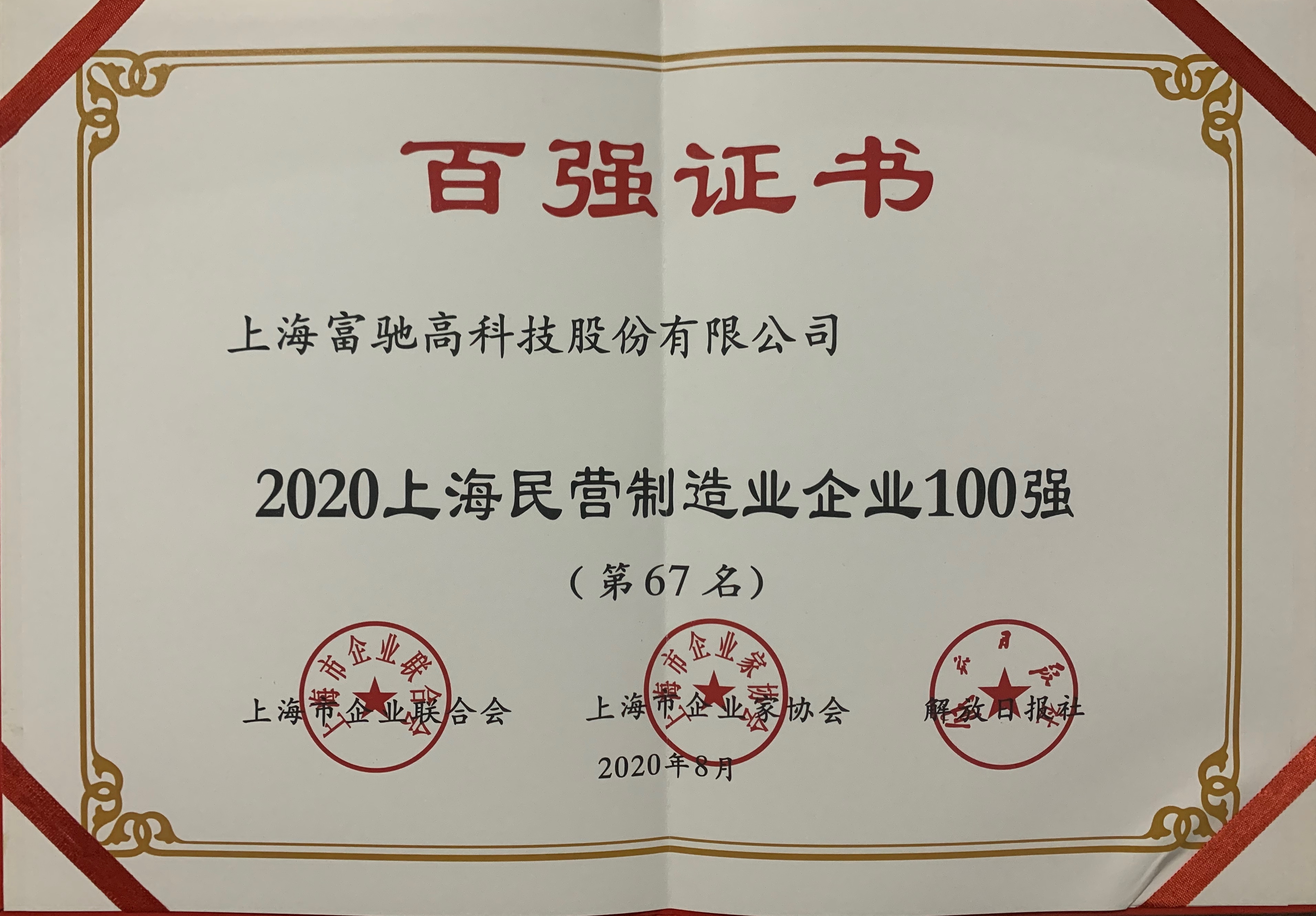 繼2019年我司獲頒同類榮譽(yù)后,我司在這次發(fā)布會(huì)上又獲頒三份“上海百強(qiáng)企業(yè)”證書,分別是“2020上海民營制造業(yè)企業(yè)100強(qiáng)”、“2020上海百強(qiáng)成長企業(yè)50強(qiáng)”、“2020上海制造業(yè)企業(yè)100強(qiáng)”。