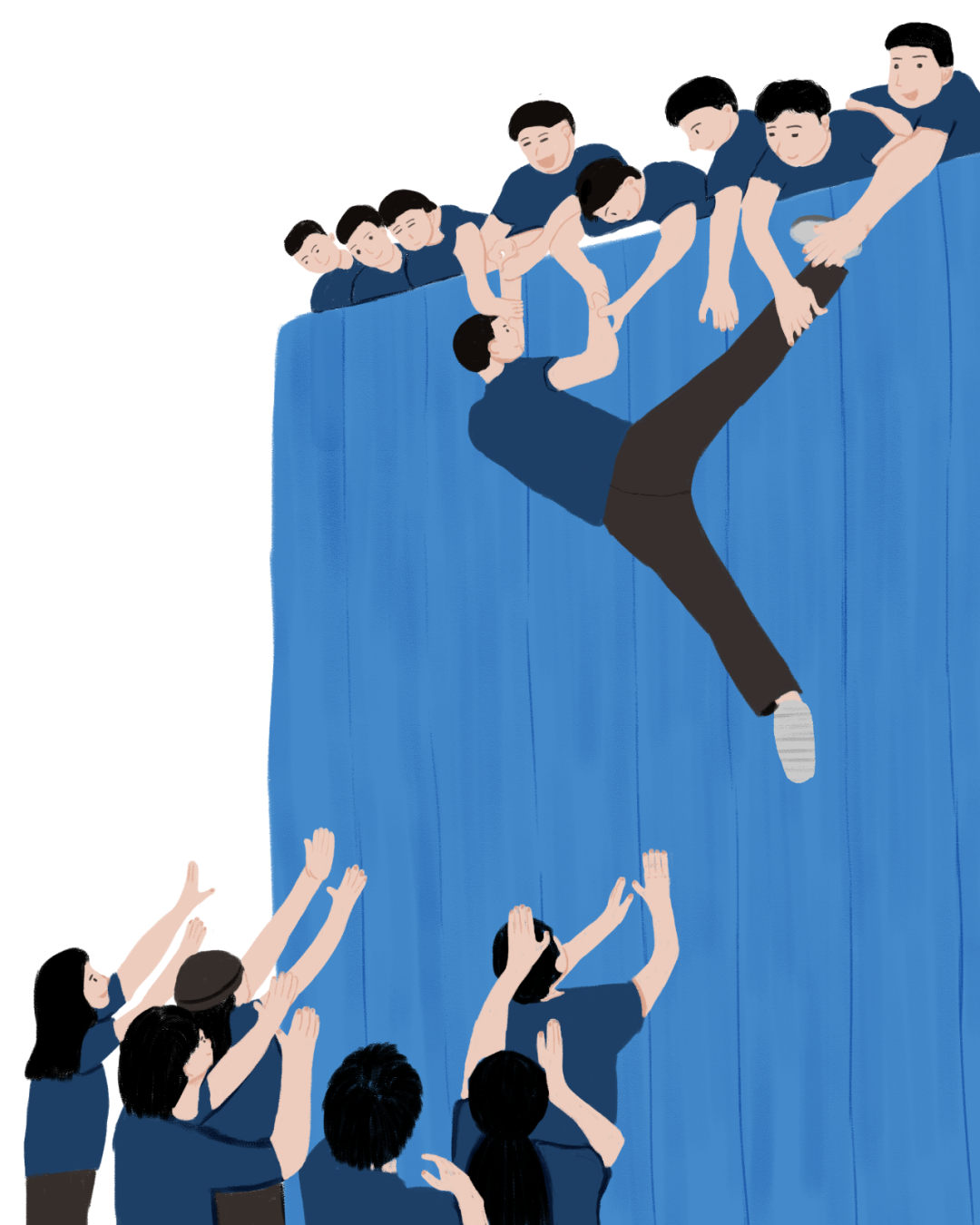 兩名隊(duì)員反復(fù)上下套圈,其余隊(duì)員要以最快的速度通過,以耗時(shí)最短的一隊(duì)為優(yōu)勝。