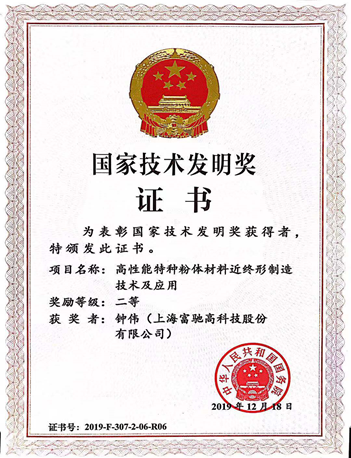 2020-01-111月10日,2019年度國(guó)家科學(xué)技術(shù)獎(jiǎng)勵(lì)大會(huì)在北京人民大會(huì)堂舉行。上海富馳高科技股份有限公司總經(jīng)理鐘偉作為主要完成人的 “高性能特種粉體材料近終形制造技術(shù)及應(yīng)用” 項(xiàng)目榮獲2019年國(guó)家技術(shù)發(fā)明二等獎(jiǎng)。