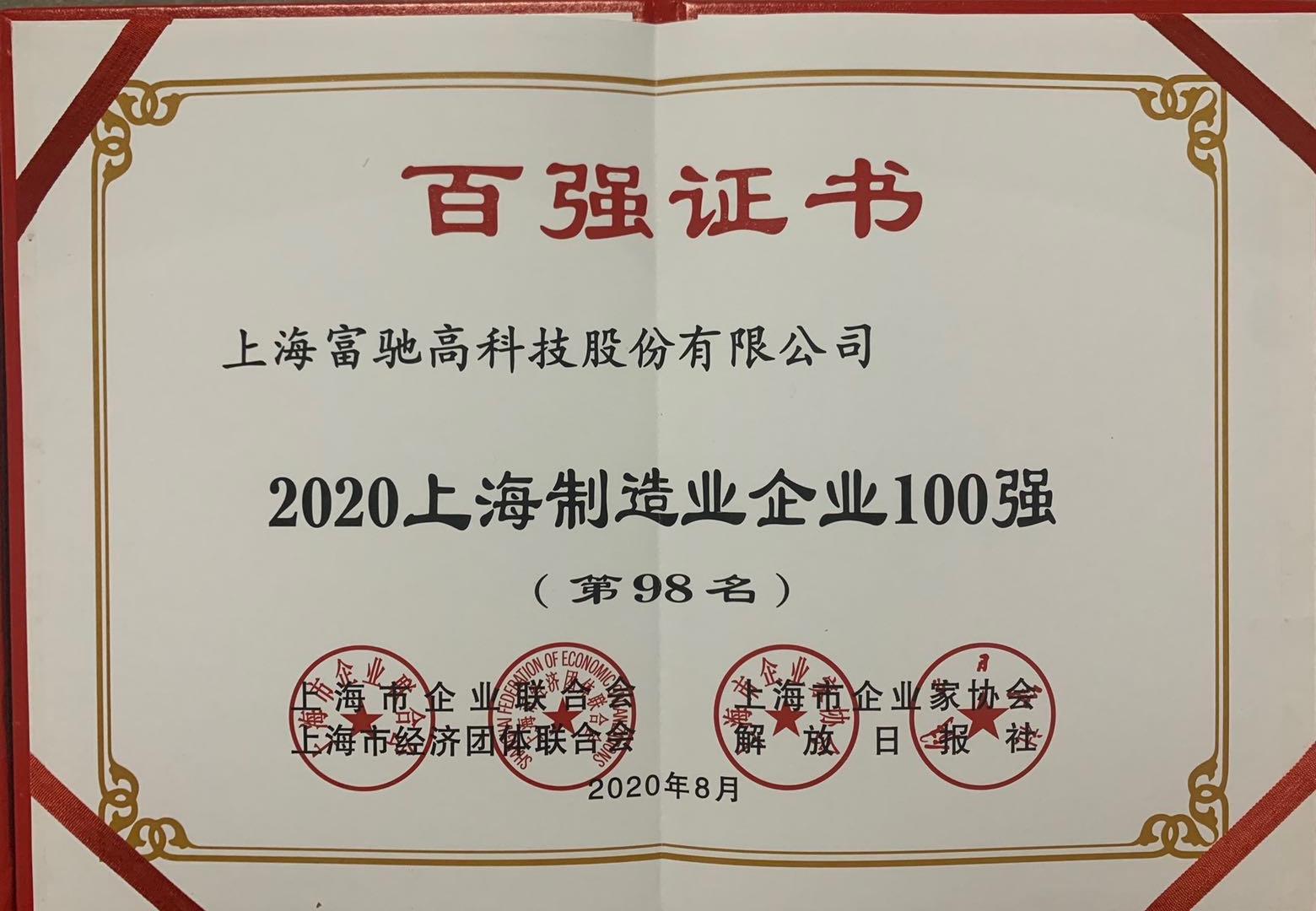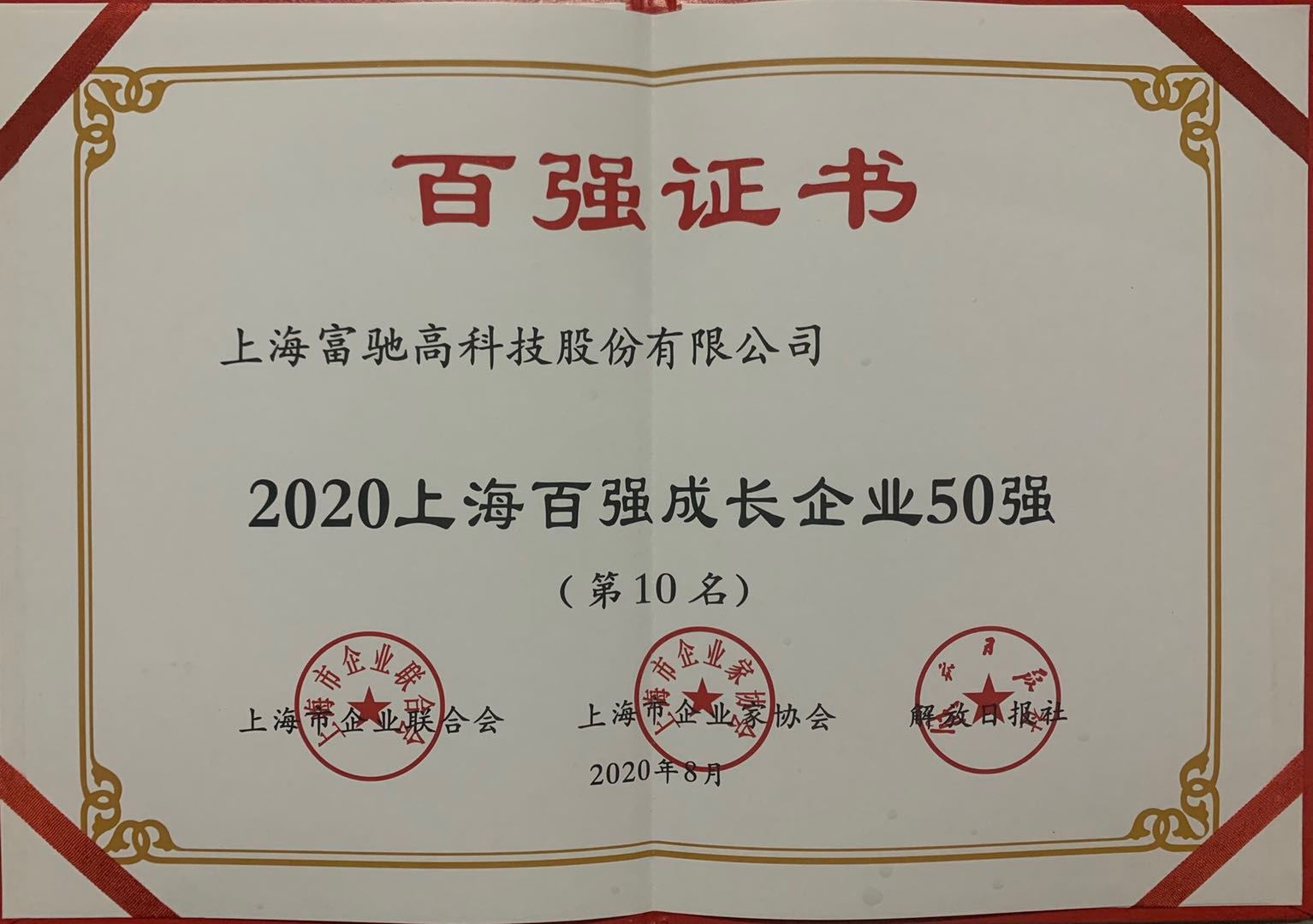 繼2019年我司獲頒同類榮譽(yù)后,我司在這次發(fā)布會(huì)上又獲頒三份“上海百強(qiáng)企業(yè)”證書,分別是“2020上海民營制造業(yè)企業(yè)100強(qiáng)”、“2020上海百強(qiáng)成長企業(yè)50強(qiáng)”、“2020上海制造業(yè)企業(yè)100強(qiáng)”。