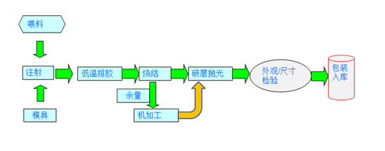 首先,選取符合CIM要求的陶瓷粉末與有機(jī)粘結(jié)劑,在一定溫度條件下,采用適當(dāng)?shù)姆椒ɑ旌铣删鶆虻奈沽?,然后,?jīng)制粒后在加熱塑化狀態(tài)下,用注射成形機(jī)注入模具型腔內(nèi)獲得成形坯,再經(jīng)過化學(xué)或溶劑萃取的方法脫脂處理,最后經(jīng)燒結(jié)致密化得到最終產(chǎn)品。